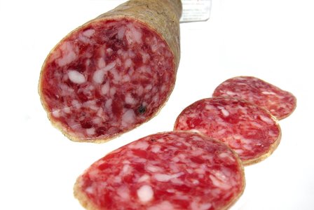Carn i greix de porc, sal, espècies, proteina aislada de soja, proteina de llet, emulgentes (E-450i, E-452i, E-451i), corrector d’acidesa E-331iii, potenciador del gust E-621, conservadors (E-252, E-250) colorant E-120, , antioxidant E-316.